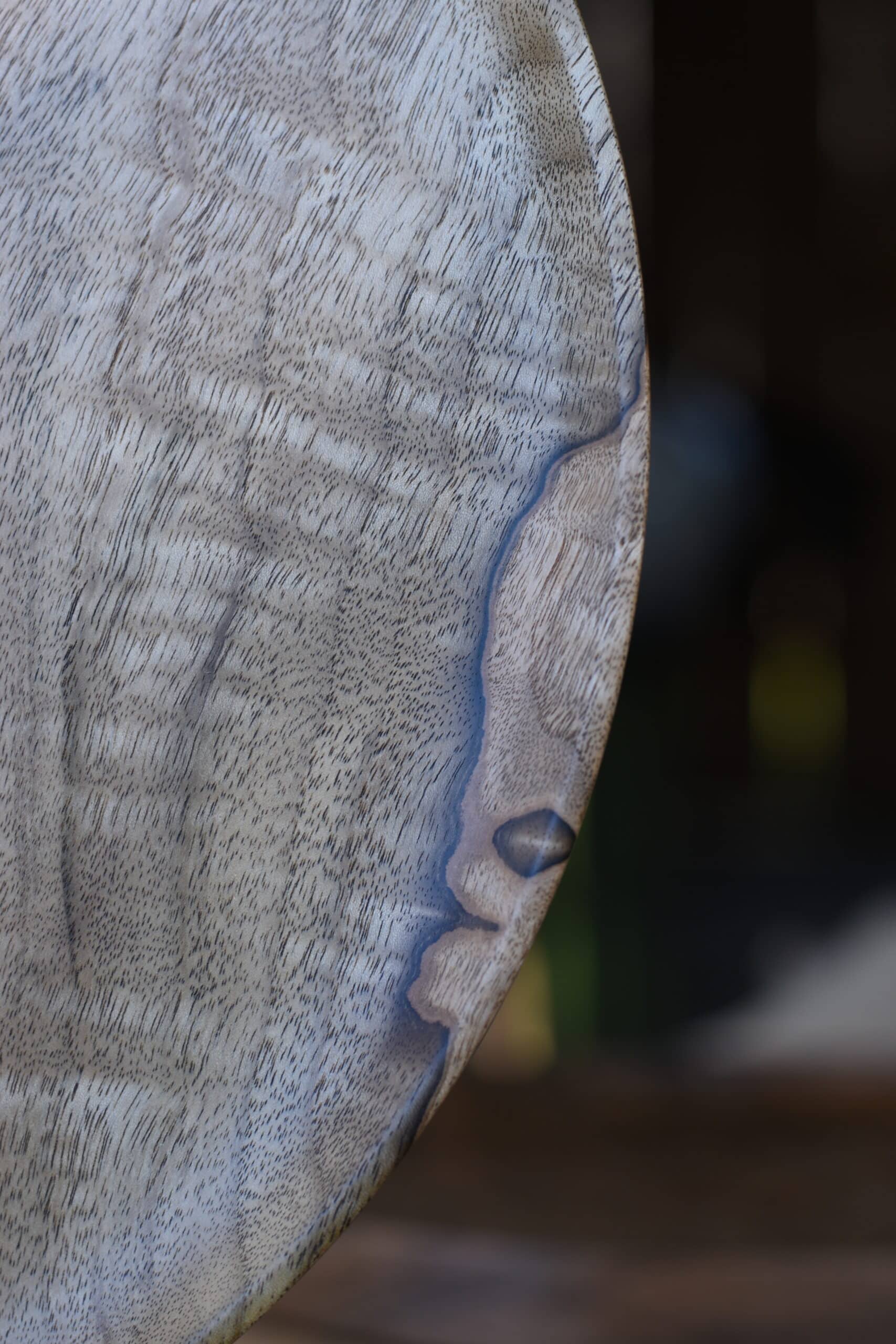 If using at the table, some foods like strawberries and beetroot can ocasionally stain light-colored wood. These stains usually fade over time, but to prevent such events from happening, avoid putting strong colored foods in your bowl. If you prefer a shiny appearance that is as close as possible to its original condition, oil regularly and avoid scratching by using wooden cutlery. If a richly patinated surface that reflects history is desired, oil once in a while and use your bowl with normal, common-sense care.